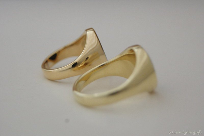 23 juli 2015Op deze foto is het verschil tussen 14kt en 18kt goed zichtbaar. Het 18kt goud is iets roder en warmer van kleur dan het 14kt geelgoud. We kunnen alle ringen in zowel 14kt als 18kt verzorgen.